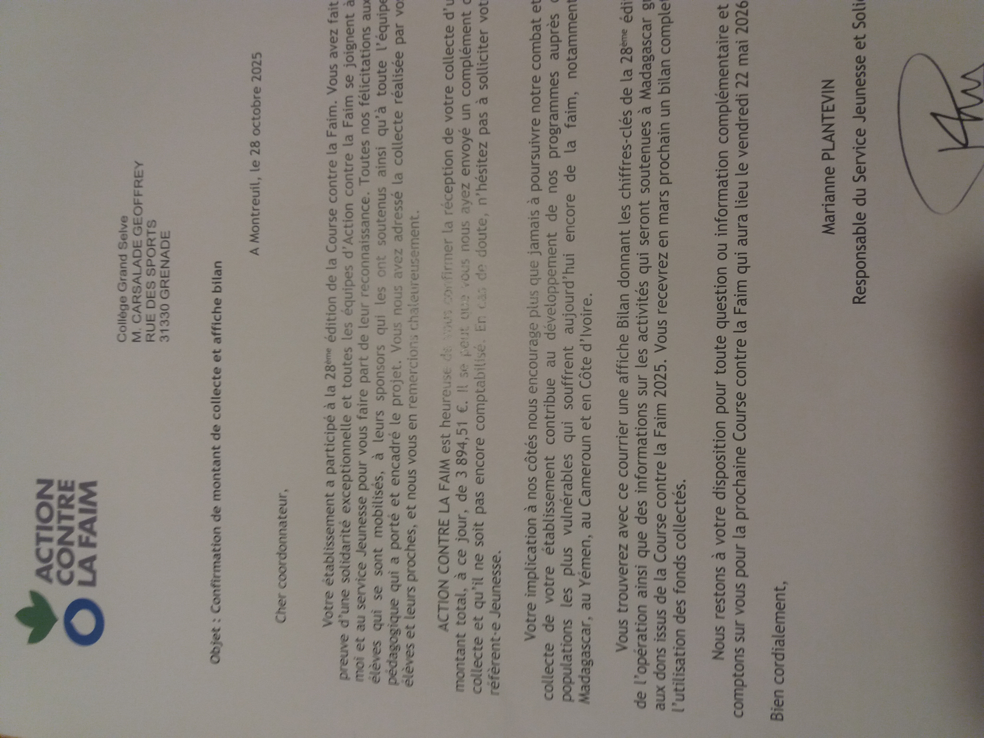 C’est maintenant au tour des parrains d’honorer leurs promesses de don. En effet, les élèves ont depuis le 13 octobre récupéré leurs livrets de parrainage. Ils ont jusqu’au 14 novembre pour récupérer les dons. Ils sont demandés de préférence en chèque à l’ordre du FSE qui reversera la moitié à Action contre la faim, comme cela était indiqué dans les livrets. L’association internationale remercie chaleureusement le collège Grand Selve de les avoir associés à 2 courses solidaires en 2025. Sur celle du printemps dernier, ce sont près de 3900 € qui ont été reversés. (cf pièce jointe).