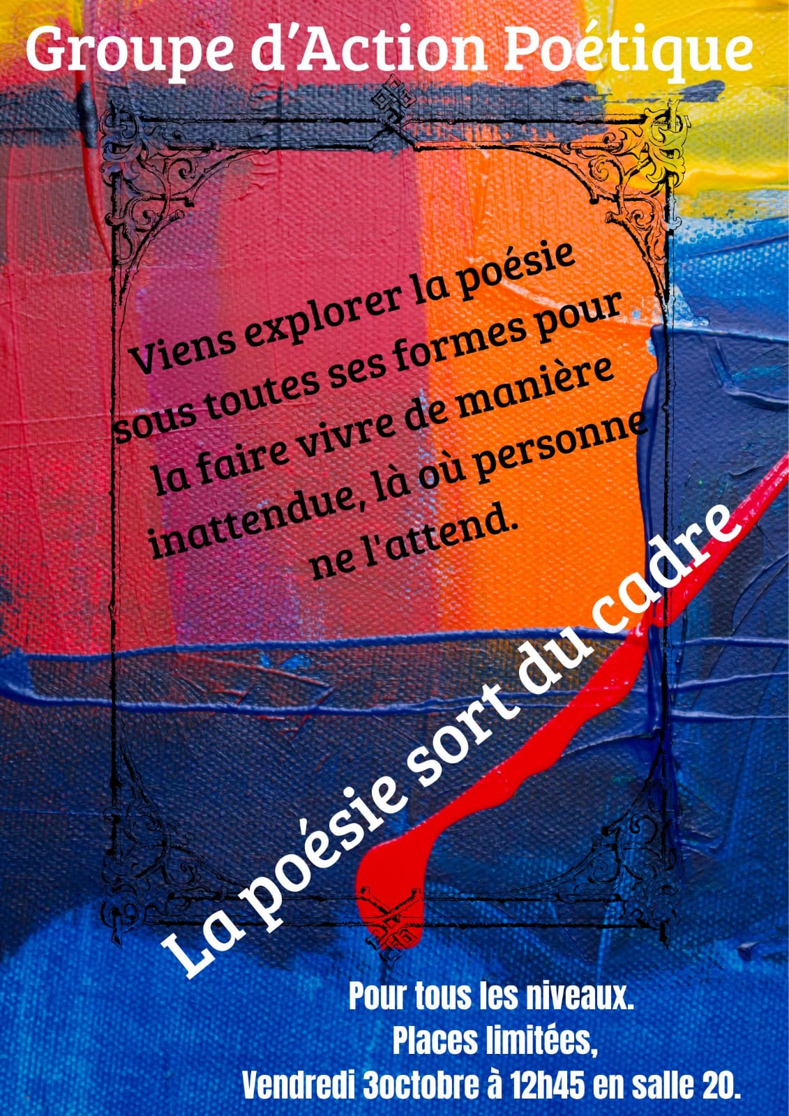 Viens découvrir la poésie sous un autre angle, laisser libre cours à ta créativité et diffuser nos créations dans tout le collège (interventions sonores ou silencieuses, installations...)